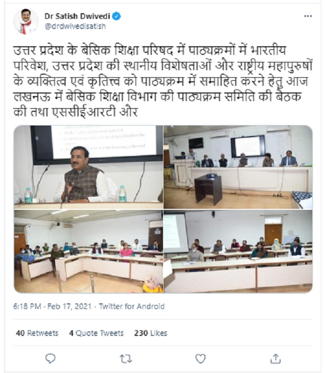 Uttar Pradesh Basic Education Department and Basic Education Council held a meeting to take a review of the state schools' syllabi. The officials of the State Council of Education, Research and Training (SCERT) also took part in the discussion to rework the school curriculum and include the Indian environment, local characteristics of Uttar Pradesh and chapters on Indian personalities.