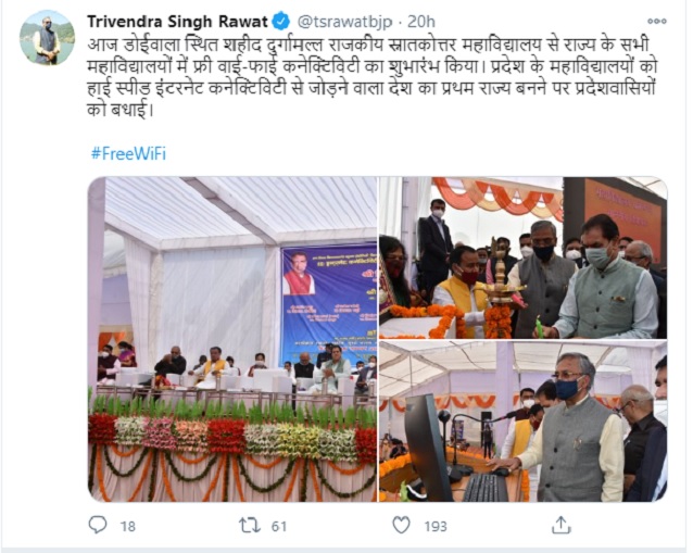 Uttarakhand Chief Minister Trivendra Singh Rawat has launched a free high-speed WiFi service for all the government colleges and universities in the state. He launched the service at a college in his constituency Doiwala.