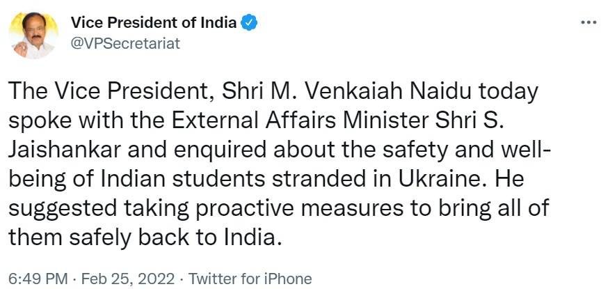 Vice President secretary has tweeted, "The Vice President, Shri M. Venkaiah Naidu today spoke with the External Affairs Minister Shri S. Jaishankar and enquired about the safety and well-being of Indian students stranded in Ukraine. He suggested taking proactive measures to bring all of them safely back to India."