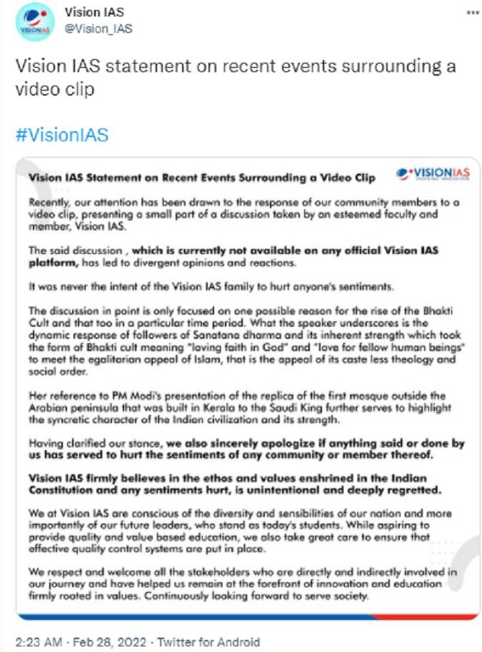 The institute apologised and stood by the misleading statement that was made by the faulty by mentioning it as the Bhakti Movement a ‘cult’ and said, “Having clarified our stance, we also sincerely apologise if anything said or done by us has served to hurt the sentiments of any community or member thereof. Vision IAS firmly believes in the ethos and values enshrined in the Indian Constitution, and any sentiments hurt, is unintentional and deeply regretted.”