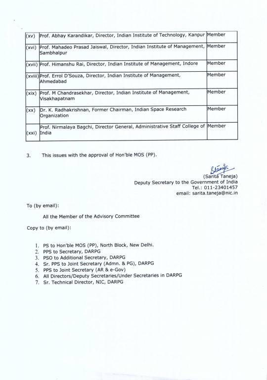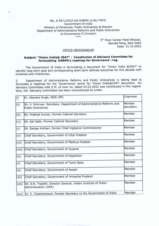 “Department of Administrative Reforms and Public Grievances is taking lead to formulate a roadmap for the 'Governance' sector for 'Vision India@2047' document. An Advisory Committee vide O.M. of even no. dated 03.02.2022 was constituted in this regard. Now, the Advisory Committee has been reconstituted,” the notice further stated.