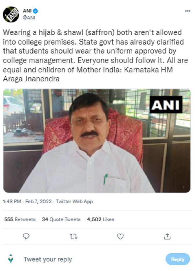 Wearing a hijab & shawl (saffron) both aren’t allowed into college premises. The state government has already clarified that students should wear the uniform approved by the college management, the Karnataka Home Minister said.