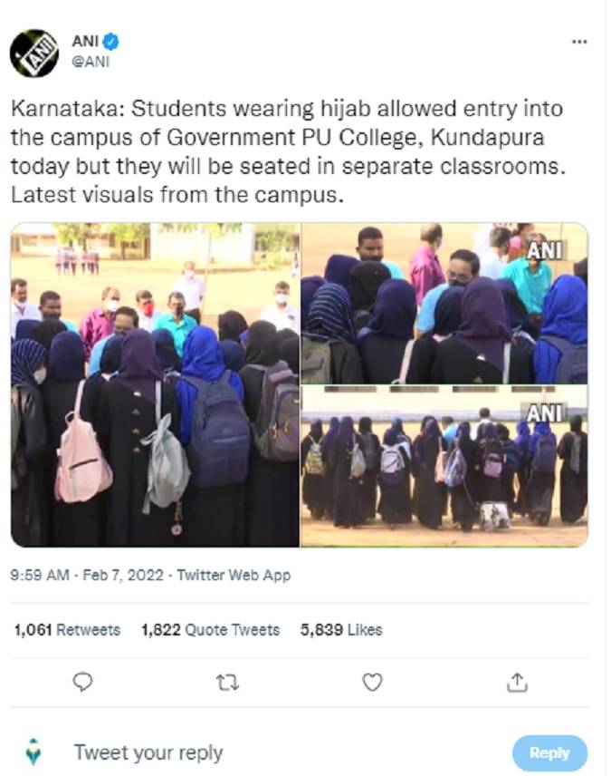 After several days of protest by hijab-wearing students outside the gates, the Government Junior PU college in Kundapur in Udipi district allowed the young women on campus this morning but controversially seated them in separate classrooms without any lessons. However, college officials said that this was done to avoid overcrowding outside the gate.