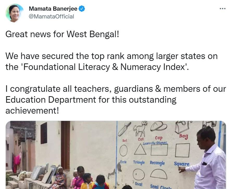 Mamata Banerjee said in a tweet, “Great news for West Bengal! We have secured the top rank among larger states on the 'Foundational Literacy & Numeracy Index’. I congratulate all teachers, guardians & members of our Education Department for this outstanding achievement!”