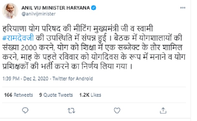 "Haryana Yoga Council's meet concluded in presence of CM and Swami Ramdev. It was decided to increase number of Yogashalas to 2000, to include Yoga as a subject in education, to celebrate the first Sunday of the month as a Yoga Day, and to recruit Yoga instructors" Mr Vij tweeted.