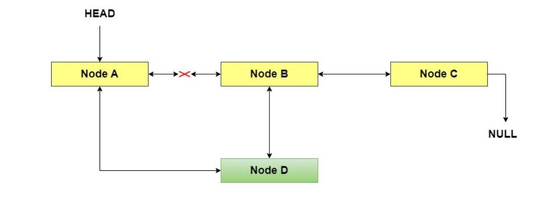 This approach ensures the pointers are modified in accordance with the new node. Take a look at the below image for reference: