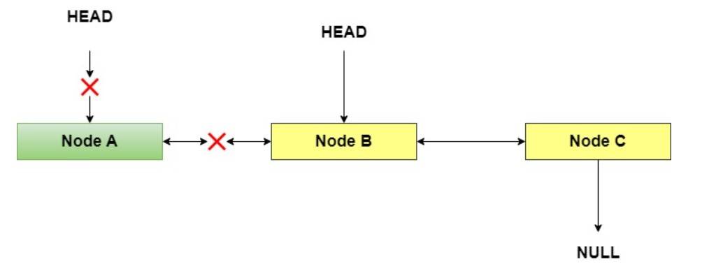 # If there is only one node elif self.head.next is None: self.head = None else: # Rearrange pointers to delete the first node self.head = self.head.next self.head.prev = None