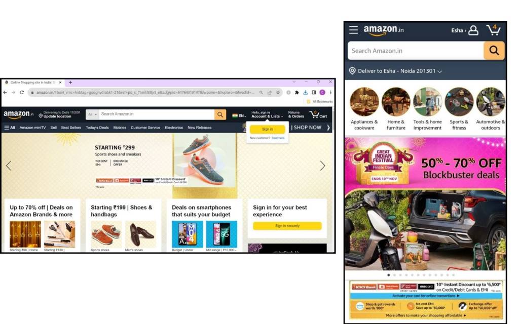 - Browsing Products: On mobile, Amazon ensures that product browsing is straightforward with a focus on clear images and essential product information due to the smaller screen size.