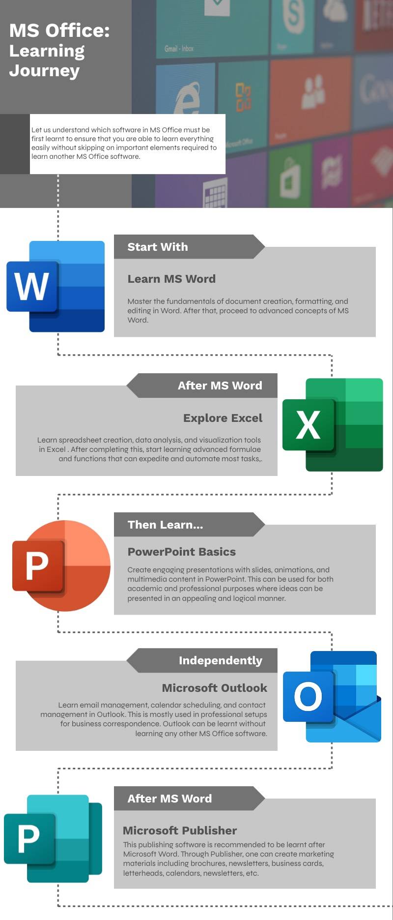 It is also important to understand which software must be learnt first to ensure that every software can be leverage optimally. Those who learn MS Office suite software in a chronological order will be able to understand the details of each one. Here is an infograph to understand this:
