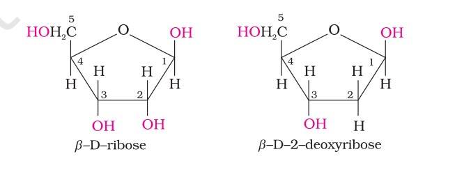 When we hydrolyse DNA (or RNA), it forms pentose sugar, phosphoric acid, and nitrogen. It contains heterocyclic compounds called bases. The sugar moiety in DNA is β-D-2-deoxyribose, and in RNA sugar moiety is β-D-ribose.