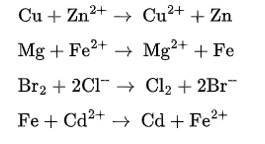 Ans: Redox couple are given as Cu2+/Cu and Zn2+/Zn Mg2+/Mg and Fe2+ /Fe Br2/Br- and Cl2 / Cl- Fe2+ /Fe and Cd2+/Cd |