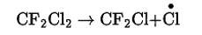 In the stratosphere, chlorofluorocarbons get broken down by powerful UV radiations, releasing chlorine free radical. This can be shown as-