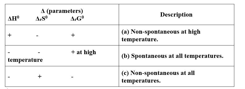 Ans: We know, ΔStotal = ΔSsys + ΔSsurr When a system is in thermal equilibrium with its surroundings, the surroundings' temperature is the same as the system's. Furthermore, a rise in the enthalpy of the surroundings equals a decrease in the system's enthalpy. As a result of the entropy shift in the environment, ΔSsurr = ΔHsurr/T = -ΔHsys/T ΔStotal = ΔSsys = (-ΔHsys/T) Rearranging the above equation: ΔStotal = TΔSsys - ΔHsys For spontaneous process, ΔStotal > 0, so TΔSsys - ΔHsys> 0 ⇒ ( - ΔHsys - TΔSsys) > 0 The above equation can be written as - ΔG > 0 ΔG = ΔH - TΔS < 0 ΔHsys is the enthalpy change of a reaction, TΔSsys is the energy which is not available to do useful work. As a result, G is a measure of 'free energy,' as it is the net energy available to conduct beneficial work. As a result, it's also known as the reaction's free energy. At constant pressure and temperature, G gives a set of conditions for spontaneity, (i) If ΔG is negative (<0), the process is spontaneous. (ii) If ΔG is positive (>0), the process is nonspontaneous. Unit of ΔG is Joule. The reaction will be spontaneous at high temperature.