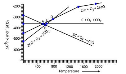 Ans: From Ellingham diagram, we know that ΔG° (C,CO) < ΔG° (Fe,Fe), the following reactions are: C+ O2→CO 2Fe+O2→2FeO Therefore, FeO can be reduced to Fe by coke. |
