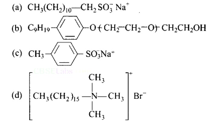 (i) Anionic detergents – These are sodium salts of sulphonated long chain alcohols or hydrocarbons and sodium alkyl benzene sulphonates. e.g., CH3 (CH2)10CH2OSO3– Na+