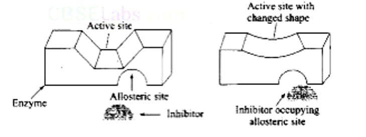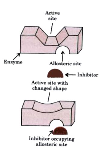 (ii) Some drugs bind to a different site of enzyme called allosteric site. It changes the shape of the active site and substrate cannot recognize it. Such enzymes are called non-competitive inhibitor the bond formed between enzyme and an inhibitor is strong covalent bond then enzyme is blocked permanently.