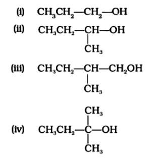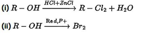 Alcohols produce matching alkyl halides when they are treated with various reagents. Alcohols, red phosphorous, and bromine treated with alcohol produce alkyl chlorides and alkyl bromide, respectively, when treated with HCl+ZnCl2. H2SO4 + KI cannot be used to convert an alcohol to alkyl iodide because they will convert KI to the equivalent acid, HI, which will then be oxidised to I2. As a result, the right statements are (i) and (ii). Correct Answer: Option (i) and (ii) |