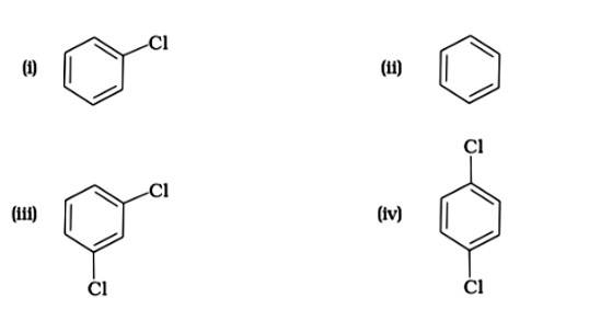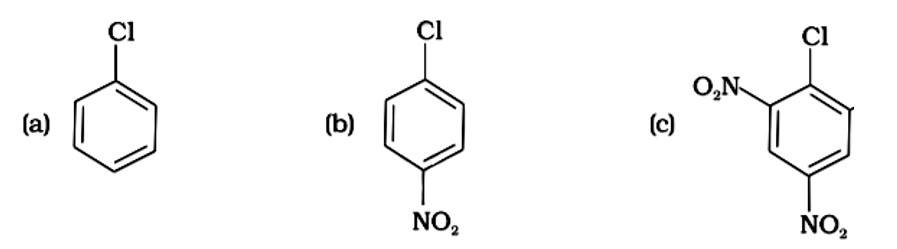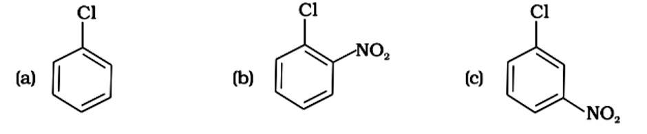 | Ans: The Correct Answer is Option (iii). Due to the resonance stabilisation of the benzene ring, the reactivity of aryl halides to nucleophilic substitution is exceedingly low. Because of resonance, the --Cl bond gains a partial double bond. The presence of an electron withdrawing --NO2 group at ortho or para positions on the ring enhances the reactivity of aryl halides. The presence of --NO2 near the C---Cl makes the molecule more reactive. The order of reactivity should be (b) > (c) > (a). The right option is (iii). |