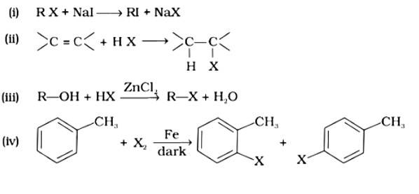 | Ans: Option (i) and (iv) have a halogen atom linked to an sp3 hybridised carbon that is single-bonded to other groups. The other possibilities are sp2 hybridised because they are linked to carbon atoms, which are coupled to other groups in double bonds. Option I and (iv) are both correct. Correct Answer: Option (i) and (iv) |