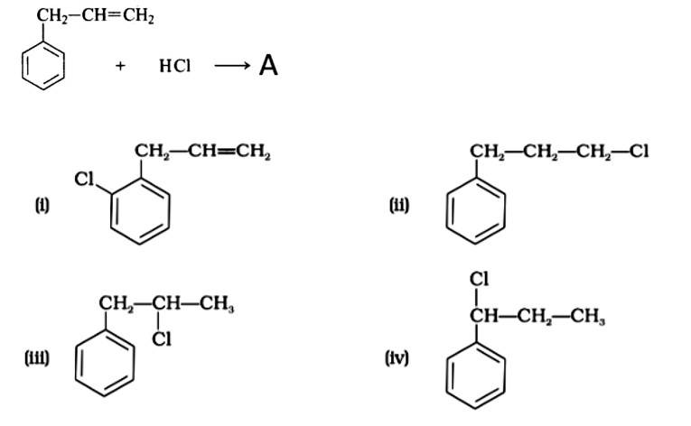 Markonikov's rule can be used to explain the results. The hydrogen from HCl is added to the carbon immediately bonded to the most hydrogen atoms, whereas the -Cl is attached to the carbon directly bonded to the least hydrogens, according to the rule. As a result, the right response is (iii).