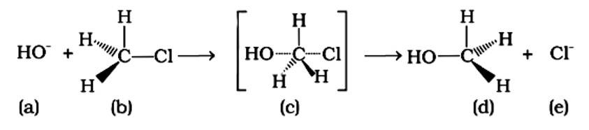 | Ans: An SN2 nucleophilic substitution reaction occurs when CH3Cl interacts with the hydroxide ion to produce CH3OH. Both OH - and Cl - are nucleophiles with an excess of electrons in this reaction. Because the binding of OH - and the leaving of Cl - occurs simultaneously in the transition state (c), the carbon atom is linked to just three hydrogens. As a result, the carbon atom becomes sp2 hybridised. Aand (C) are the right statements. Correct Answer: Option (A) and (C) |