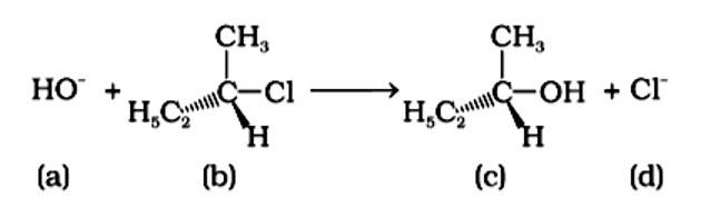 | Answer Q. No. 35 and 36 based on the following reaction. 35. Which of the following statements are correct about the mechanism of this reaction? (i) A carbocation will be formed as an intermediate in the reaction. (ii) OH–will attach the substrate (b) from one side and Cl- will leave it simultaneously from the other side. (iii) An unstable intermediate will be formed in which OH– and Cl– will be attached by weak bonds. (iv) The reaction proceeds through an SN1 mechanism. |