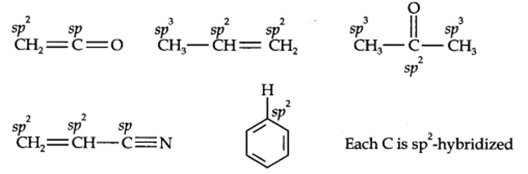| 12.1. What are the hybridisation states of each carbon atom in the following compounds? CH2=C=O, CH3CH=CH2, (CH3)2CO, CH2=CHCN, C6H6. |