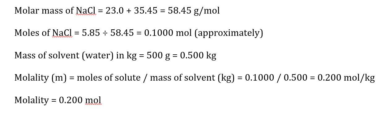 A solution is prepared by dissolving 5.85 g of NaCl in 500 g of water. Calculate the molality of the solution.