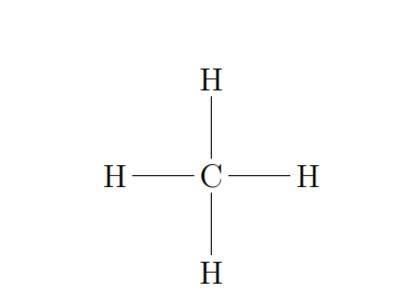 In methane , carbon is bonded to four hydrogens. The shape is tetrahedral, with carbon in the centre and the four hydrogens at the corners of the tetrahedron.