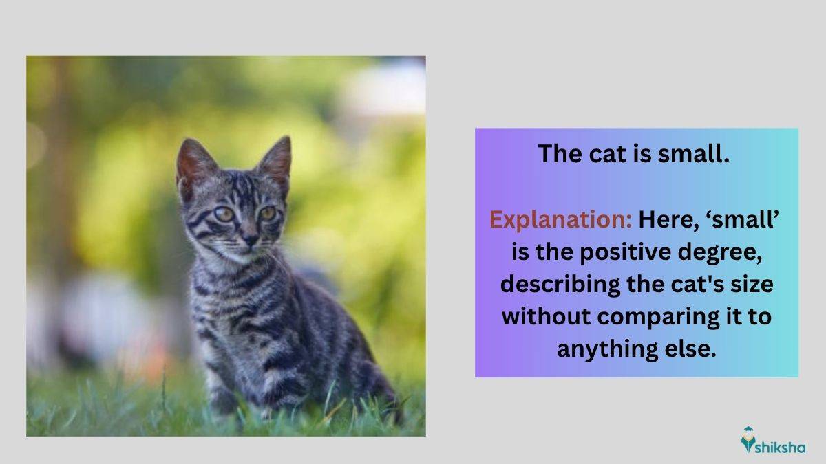 Explanation: Here, ‘small’ is the positive degree, describing the cat's size without comparing it to anything else.
