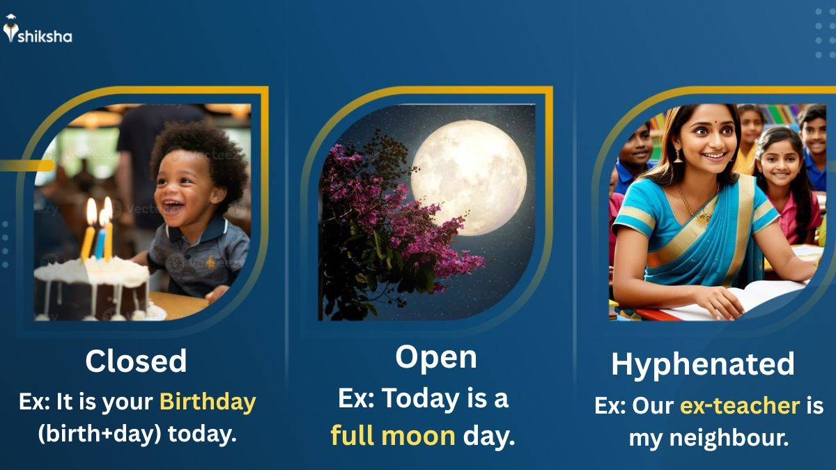 Closed | When two words are joined without any space in between | Birthday (birth+day) Sunlight (sun+light) |