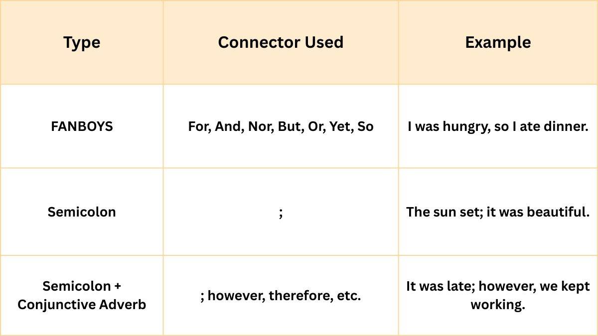 In English Grammar, compound sentences are categorized based on how the independent clauses are connected. While the basic structure remains the same, i.e. two or more independent clauses, the type of connector used determines the type of compound sentence.