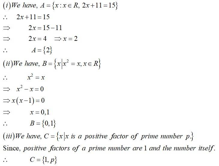 | Write the following sets in the roaster form (i) A = {x: x ∈ R, 2x + 11 = 15} (ii) B = {x | x2 = x, x ∈ R} (iii) C = {x | x is a positive factor of a prime number p} |