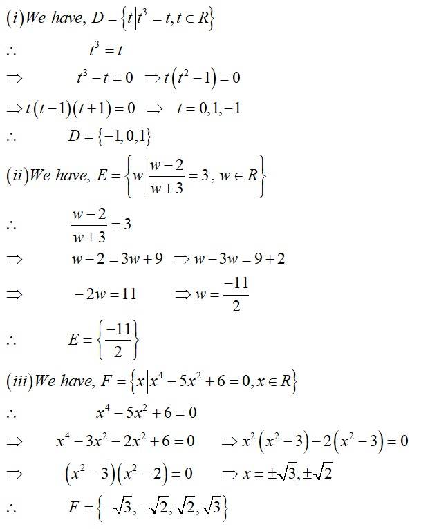 | Write the following sets in the roaster form (i) D = {t | t3 = t, t ∈ R} (ii) E = {w | =3, w ∈ R} (iii) F = {x | x4 – 5x2 + 6 = 0, x ∈ R} |