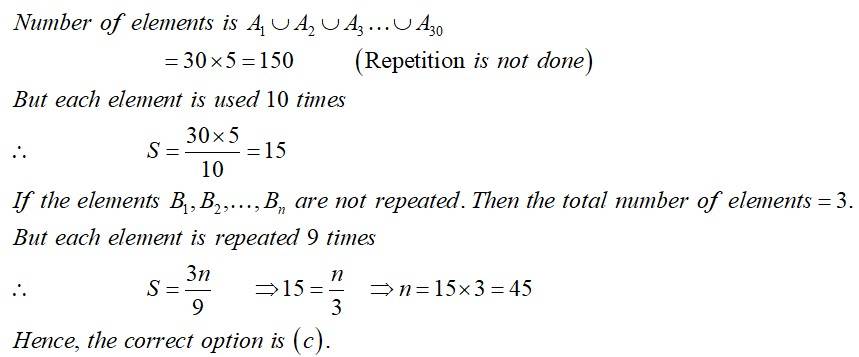 | Suppose A1, A2, ..., A30 are thirty sets each having 5 elements and B1, B2, ..., Bn are n sets each with 3 elements, let =and each element of belongs to exactly 10 of the Ai’s and exactly 9 of the B,’S. Then n is equal to (a) 15 (b) 3 (c) 45 (d) 35 |