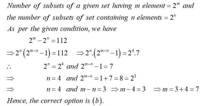 | Two finite sets have m and n elements. The number of subsets of the first set is112 more than that of the second set. The values of m and n are, respectively, (a) 4, 7 (b) 7, 4 (c) 4, 4 (d) 7, 7 |