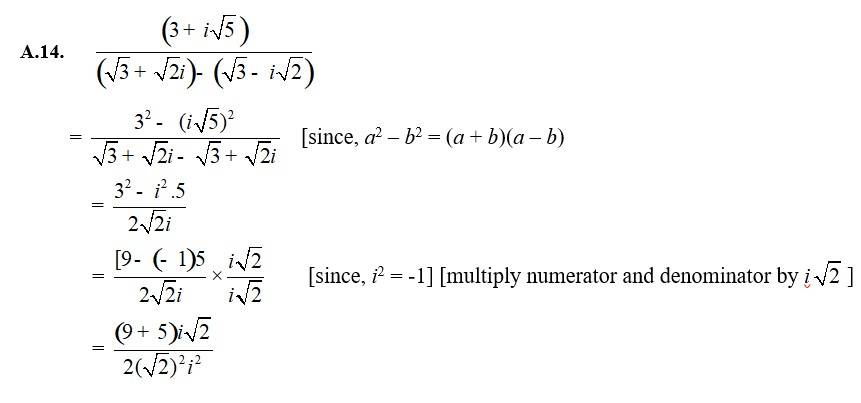 | A.12. Let z = √5 + 3i Then, = √5 - 3i And, |z|2 = ( √5 )2 + (3)2 = 5 + 9 = 14 So, multiplicative inverse of √5 + 3i is given by