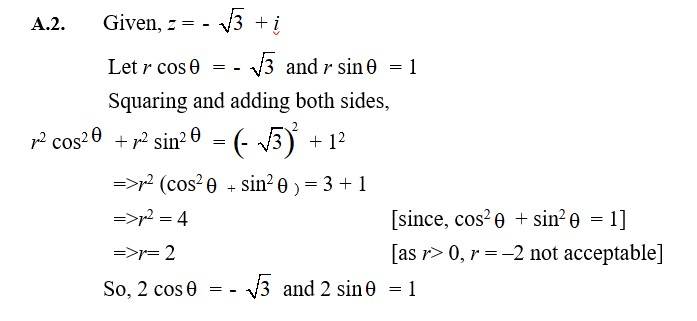 | A.1. x2 + 3 = 0 =>x2 = –3 =>x = =>x= ± √3 [since, √-1 = i] =>x = 0 ± √3 |