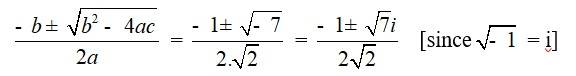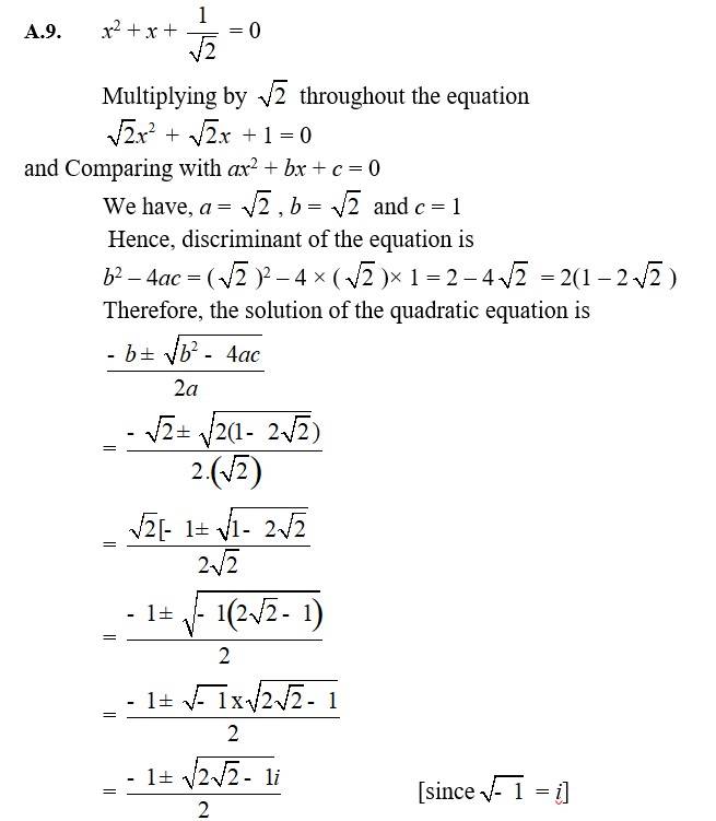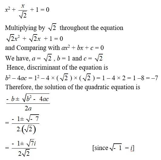 | A.2. 2x2 + x + 1 = 0 Comparing the given equation with ax2 + bx + c = 0, a = 2, b = 1 and c = 1 Hence, the discriminant of the equation is b2 – 4ac = 12 – 4 ×2×1 = 1 – 8 = –7 Therefore, the solution of the quadratic equation is