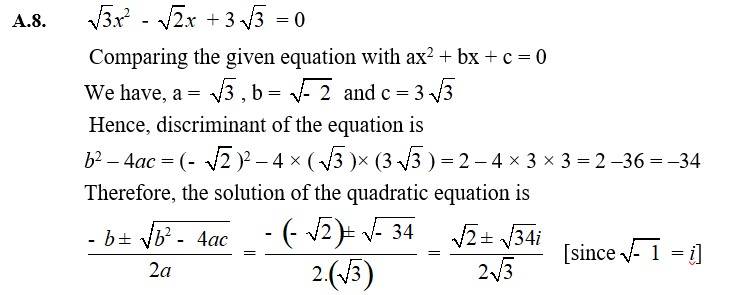| A.6. x2 – x + 2 = 0 Comparing the given equation with ax2 + bx + c = 0 We have, a = 1, b = –1 andc = 2 Hence, discriminant of the equation is b2 – 4ac = (-1)2 – 4 × 1 × 2 = 1 – 8 = –7 Therefore, the solution of the quadratic equation is