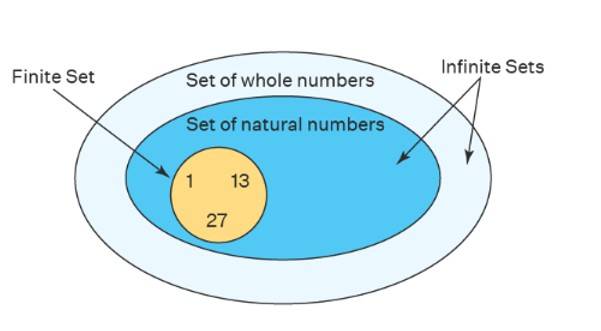 Imagine a circle representing a finite set, like . Now, picture a larger space representing the infinite set of all natural numbers and set of whole numbers.