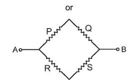 The arrangement as shown in the above diagram of Wheatstone bridge shows four terminals in which except two all are connected to each other through resistive elements. In this circuit if then and current in this is called balance point or null point. When current through the galvanometer is zero (null point or balance point) , then Here in this case products of opposite arms are equal. Potential difference between C and D at null point is zero. The null point is not affected by resistance and . It is not affected even if the positions of Galvanometer and battery ( ) are interchanged. Hence, here the circuit can be assumed to be following,