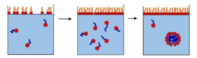 3. When surfactants are dissolved in water, they migrate to the surface/interfaces and orientates themselves at the surface with the hydrophilic parts in water and hydrophobic parts in air.