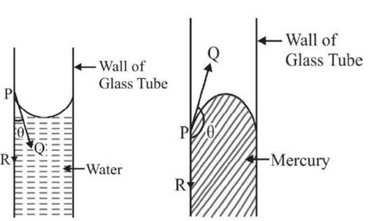 Note that the angle is measured through the liquid, as shown in the diagrams above. The diagram to the right shows two examples. Tension forces are shown for the liquidair interface, the liquid-solid interface, and the solid-air interface.