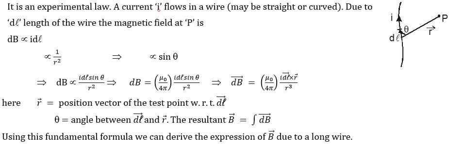 The working principle of magnetic field due to a current element is based on Biot-Savart Law. As per this law, we can determine the magnetic field in a surrounding space due to the small element of current-carrying conductor.