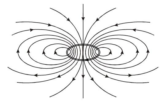 The magnetic field pattern is comparable to the magnetic field produced by a bar magnet.