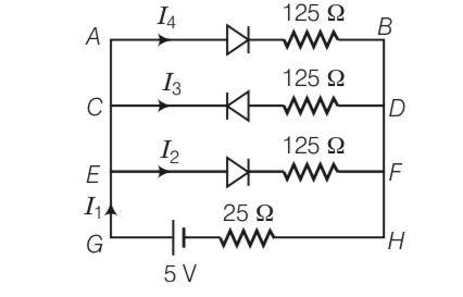 If each diode in figure has a forward bias resistance of 25 Ω and infinite resistance in reverse bias, what will be the values of the currents I1, I2, I3and I4?