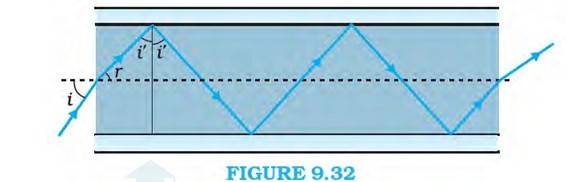 Q: Figure 9.32 shows a cross-section of a ‘light pipe’ made of a glass fibre of refractive index 1.68. The outer covering of the pipe is made of a material of refractive index 1.44. What is the range of the angles of the incident rays with the axis of the pipe for which total reflections inside the pipe take place, as shown in the figure. (b) What is the answer if there is no outer covering of the pipe?