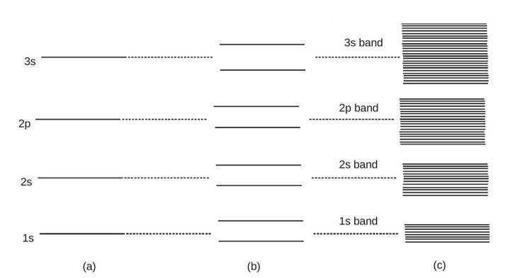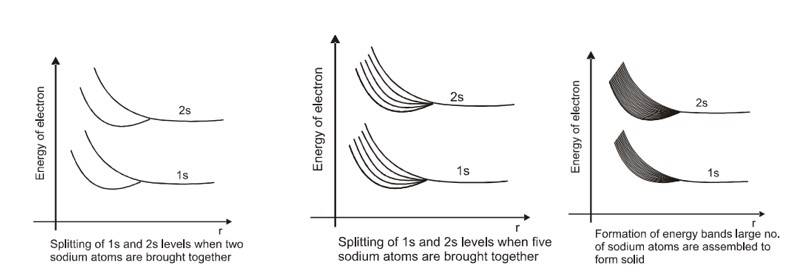 When atoms are interacting (such as in crystal) then the energy level scheme for the individual atoms as shown in figure(a) does not quite hold. The interaction between atoms affect the electron energy levels, as a result there occurs a splitting of energy levels belonging to various atoms. To understand this phenomenon in more clear terms, let us first consider the simplest case of two interacting identical atoms. Let us assume that initially they are far apart i.e. the forces of interaction between them can be neglected. [If the distance between two atoms is much larger (