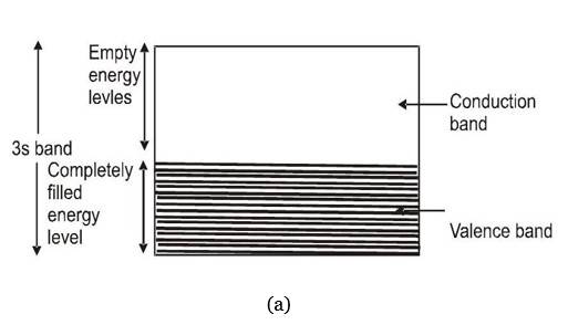 For insulators to 7 eV . As in an empty band no electron is there to take part in the process of electric conduction, such a band does not contribute in conduction. In a completely filled band very large number of electrons are present but no vacant levels to which these electrons make transition are available and hence again there will not be any conduction.